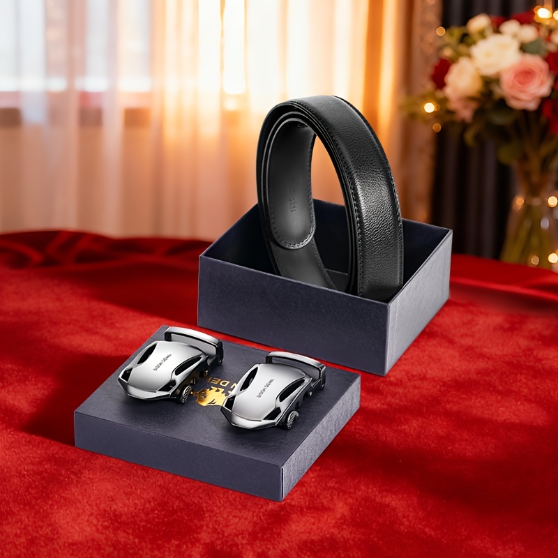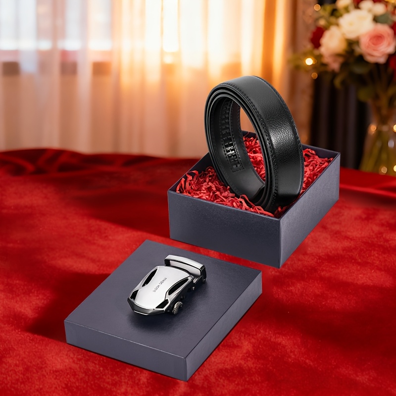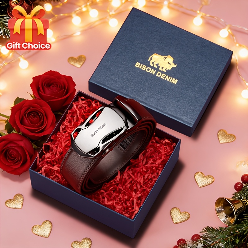 BISON DENIM Men’S Automatic Buckle Casual Belt | Second Layer Cowhide, Business Formal, Daily Multi-Functional, Adjustable, Genuine Leather, Zinc Alloy Golden Buckle, Gift Box, Suitable for Valentine’S Day and Christmas Gift