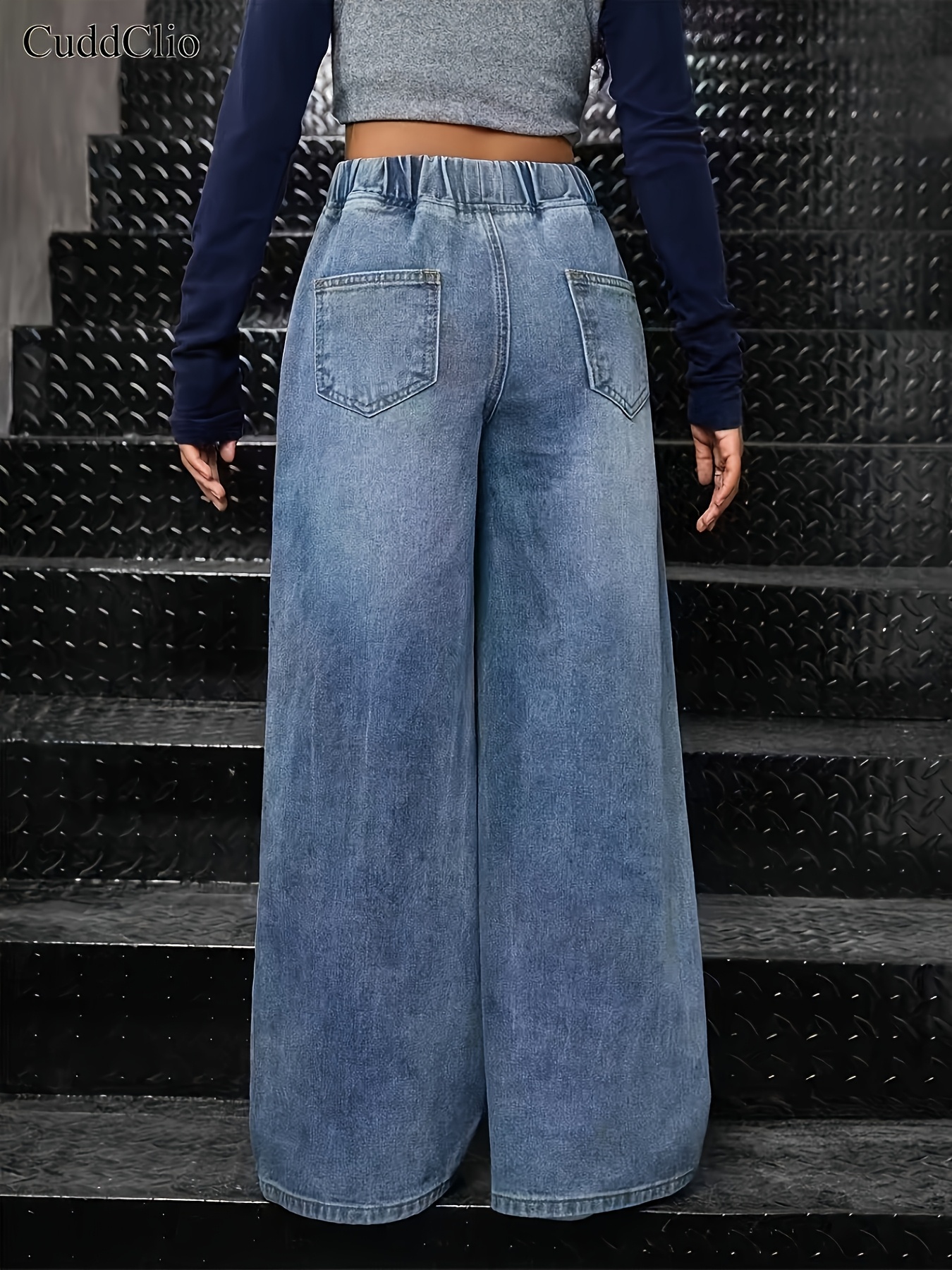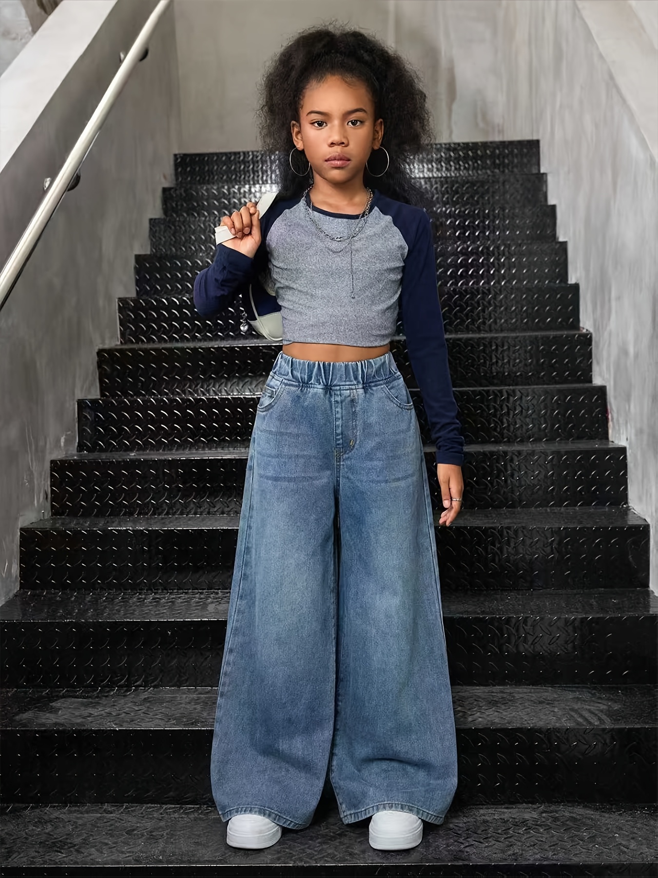 Girl’s Straight-leg Jeans, Y2K-style Washed Denim Design for Young Girls, Elastic Stretch Waistband, Loose and Comfortable Fit, Basic Fashionable Cut, Trendy and Cool Street Style, for Daily Outings, Casual Sportswear Pants, Autumn/winter Trousers