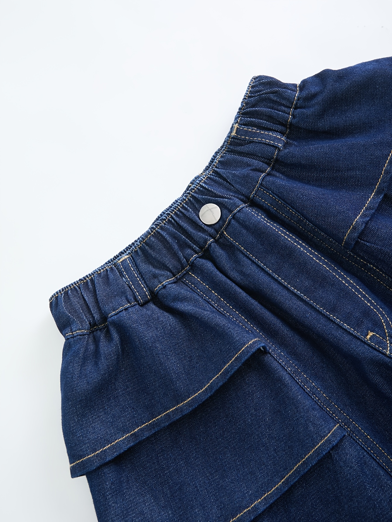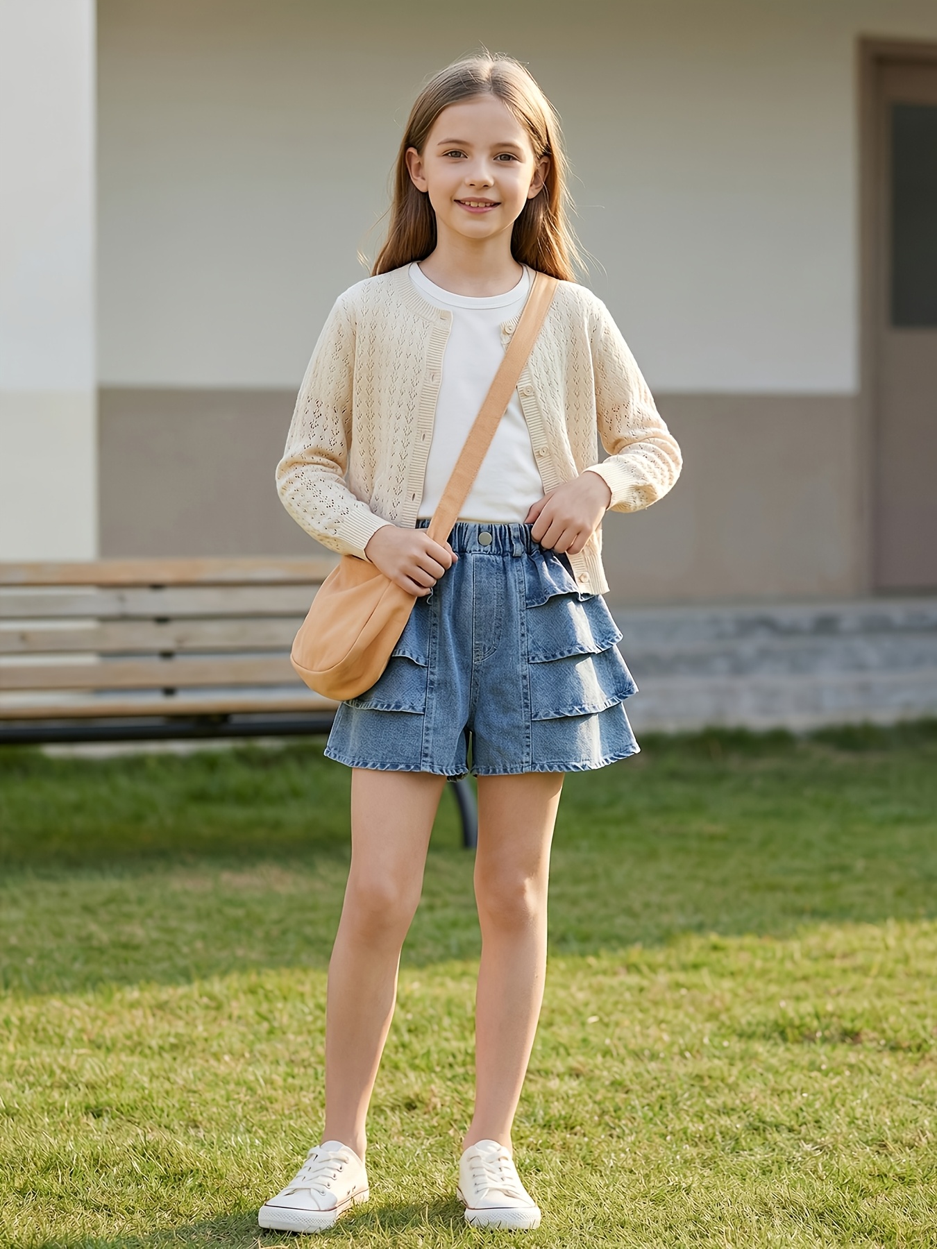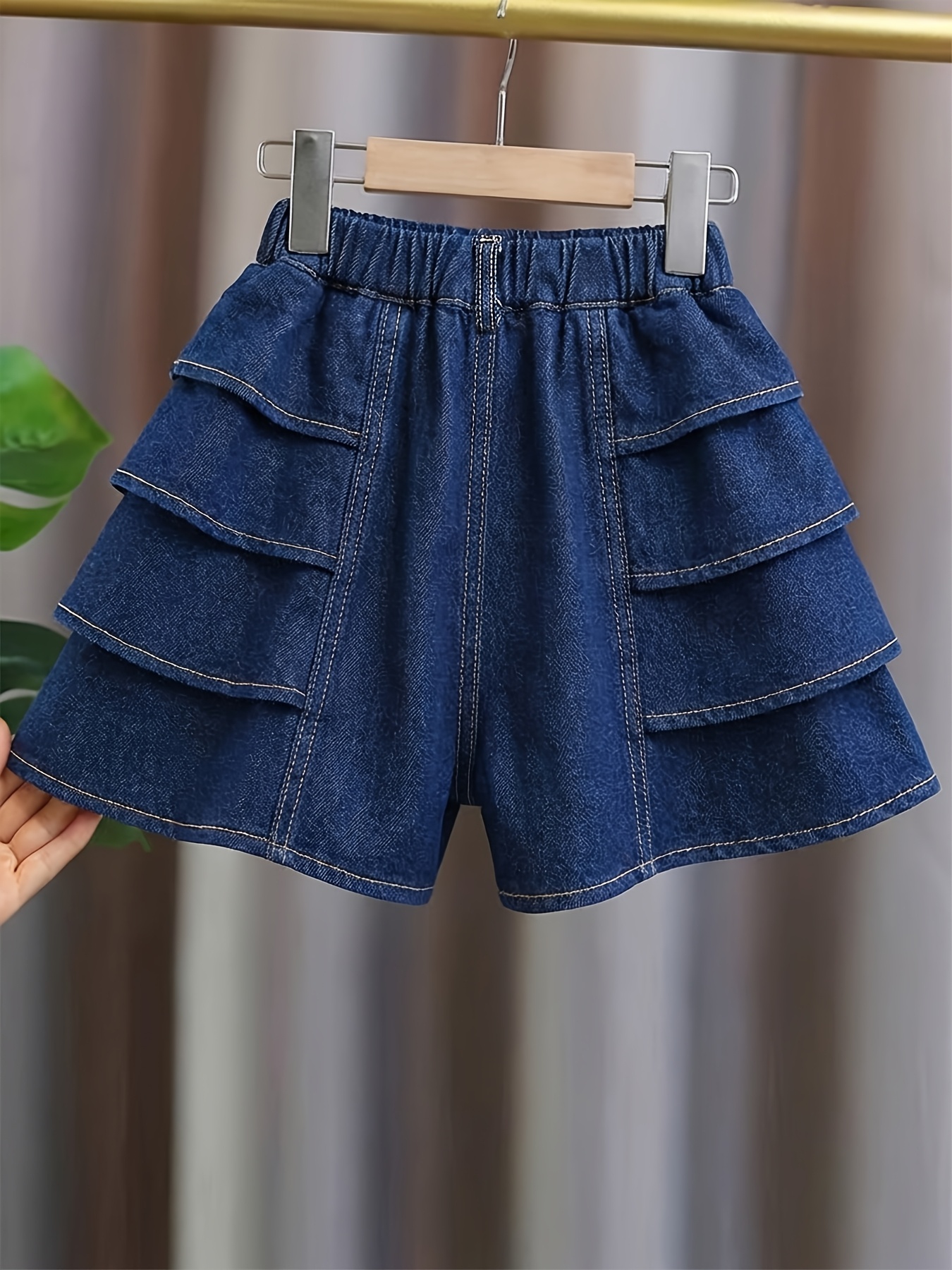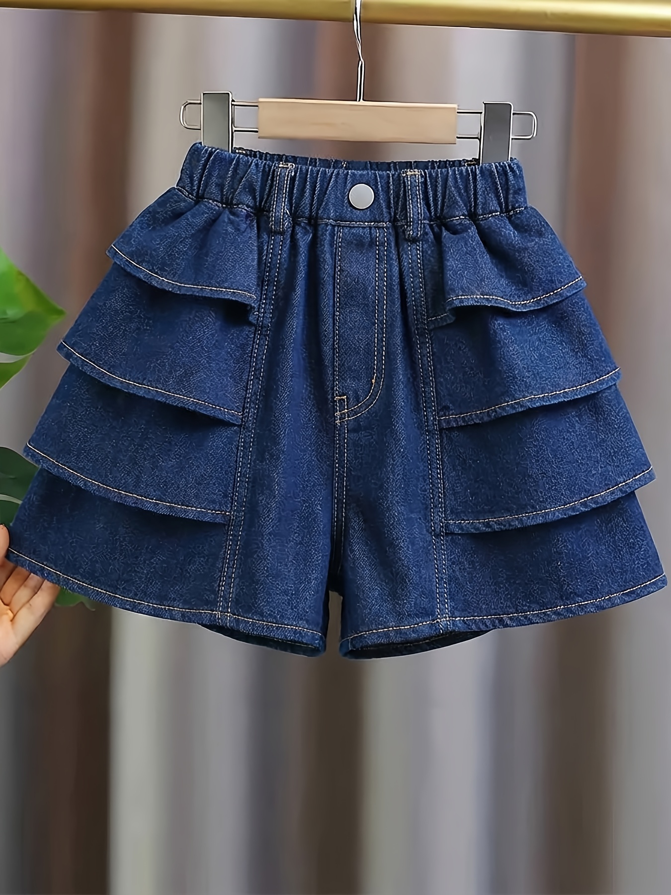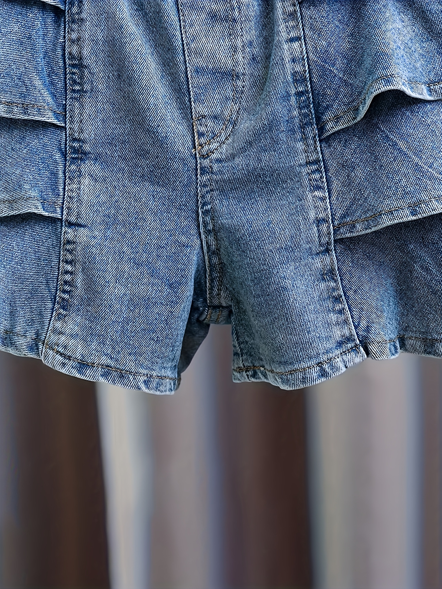 Girls’ Summer Fashion Versatile Ruffle-trim Denim Shorts, Comfortable Lightweight Vacation Beach Denim Shorts, Casual Daily Shorts, Cute Girls’ Shorts, Holiday Style Shorts, Must-have for Back-to-school Season, Elastic Waist for Comfortable Wear