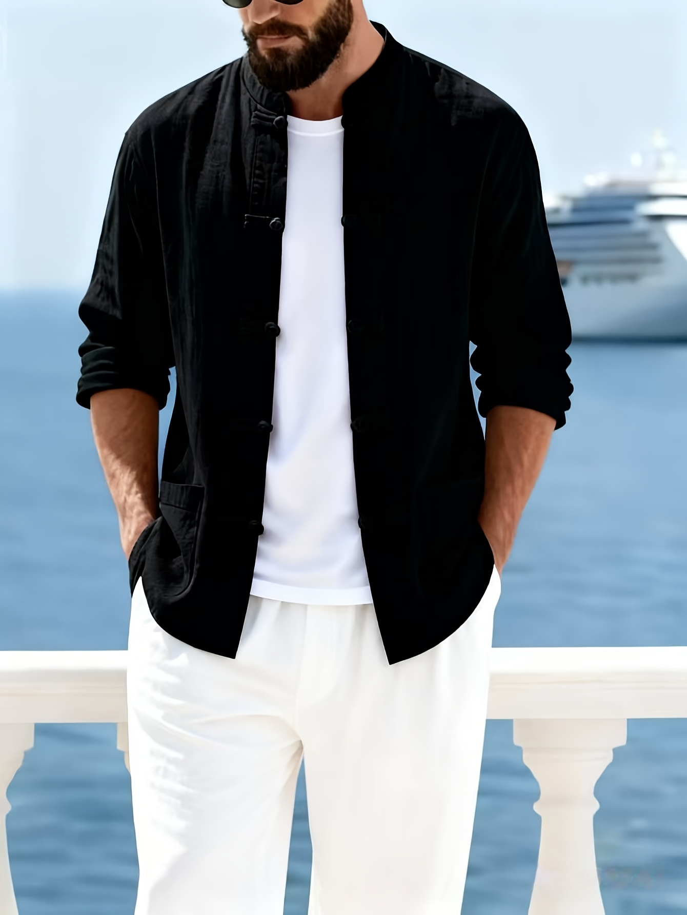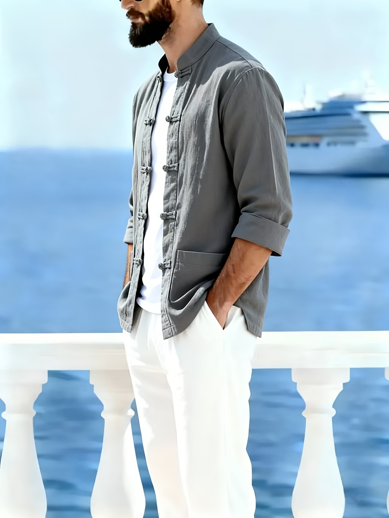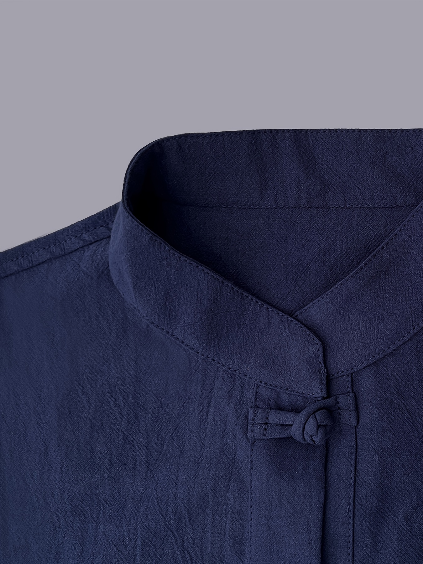 Men’s Four-Season Long-Sleeve Vacation Style Traditional Chinese Style Button- Stand Collar Shirt Casual Commuter Style, Chinese Size, Please Check The Size Guide Carefully