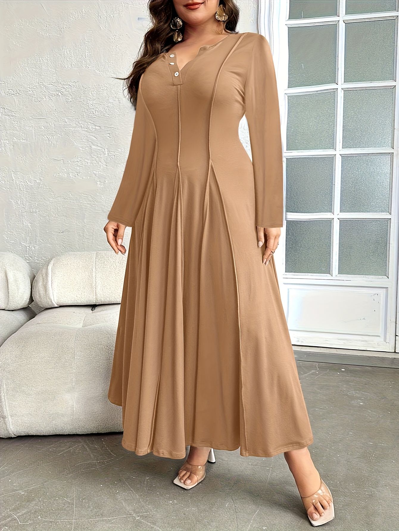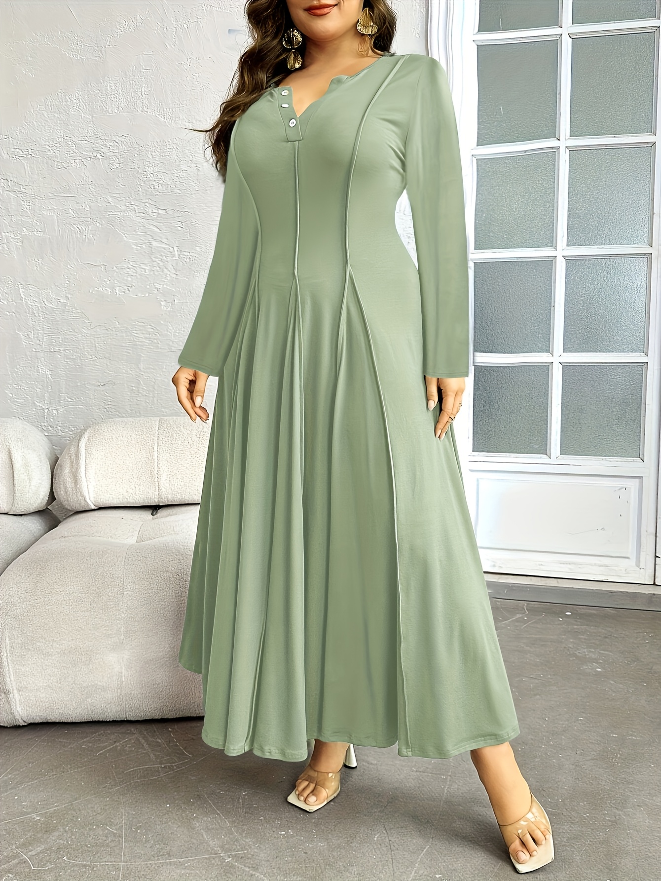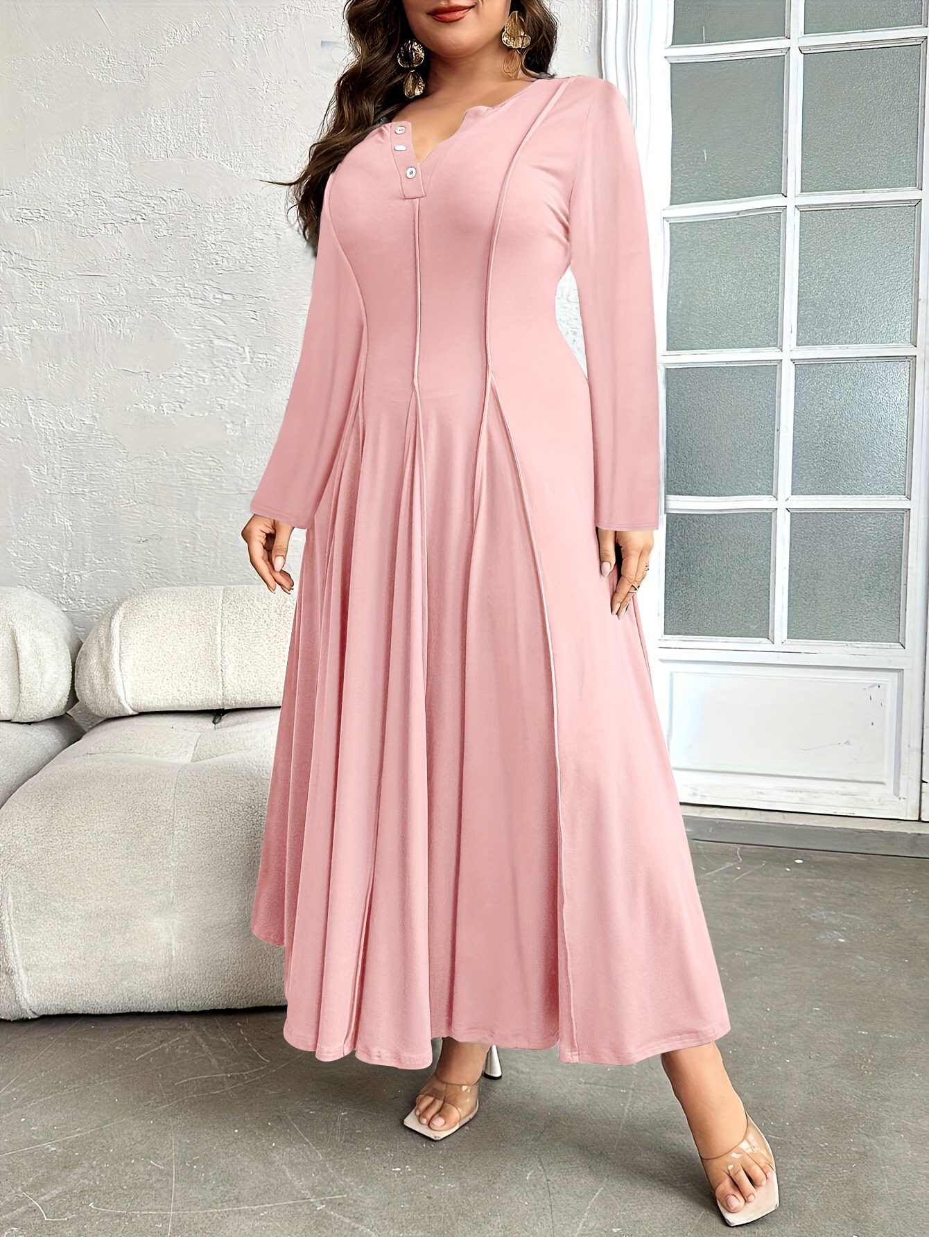 Plus Size, Button- Collar with Pleated Detail Long Sleeve Dress, Suitable for Beach, Party, Summer, Casual, Vacation, and Dating