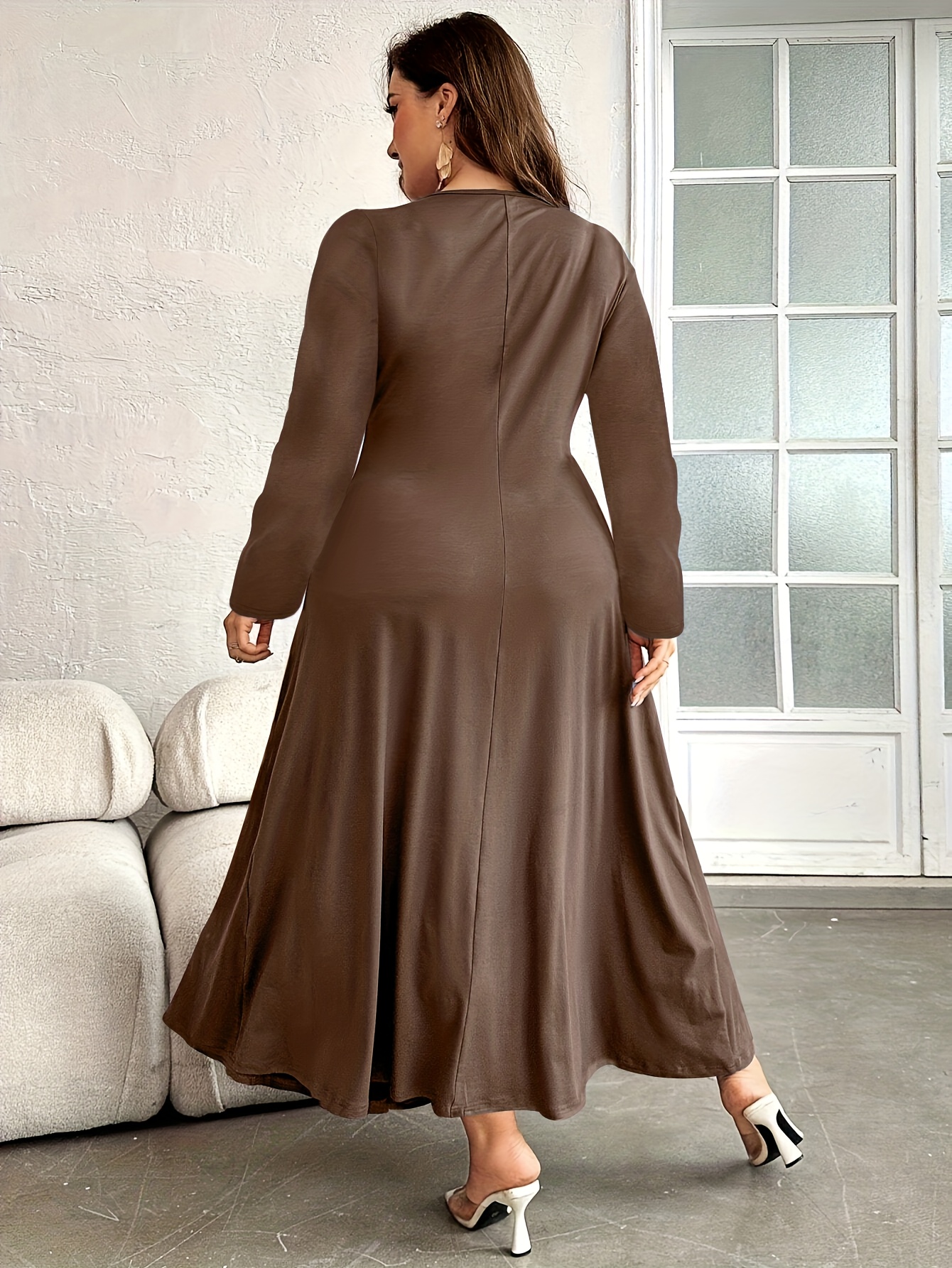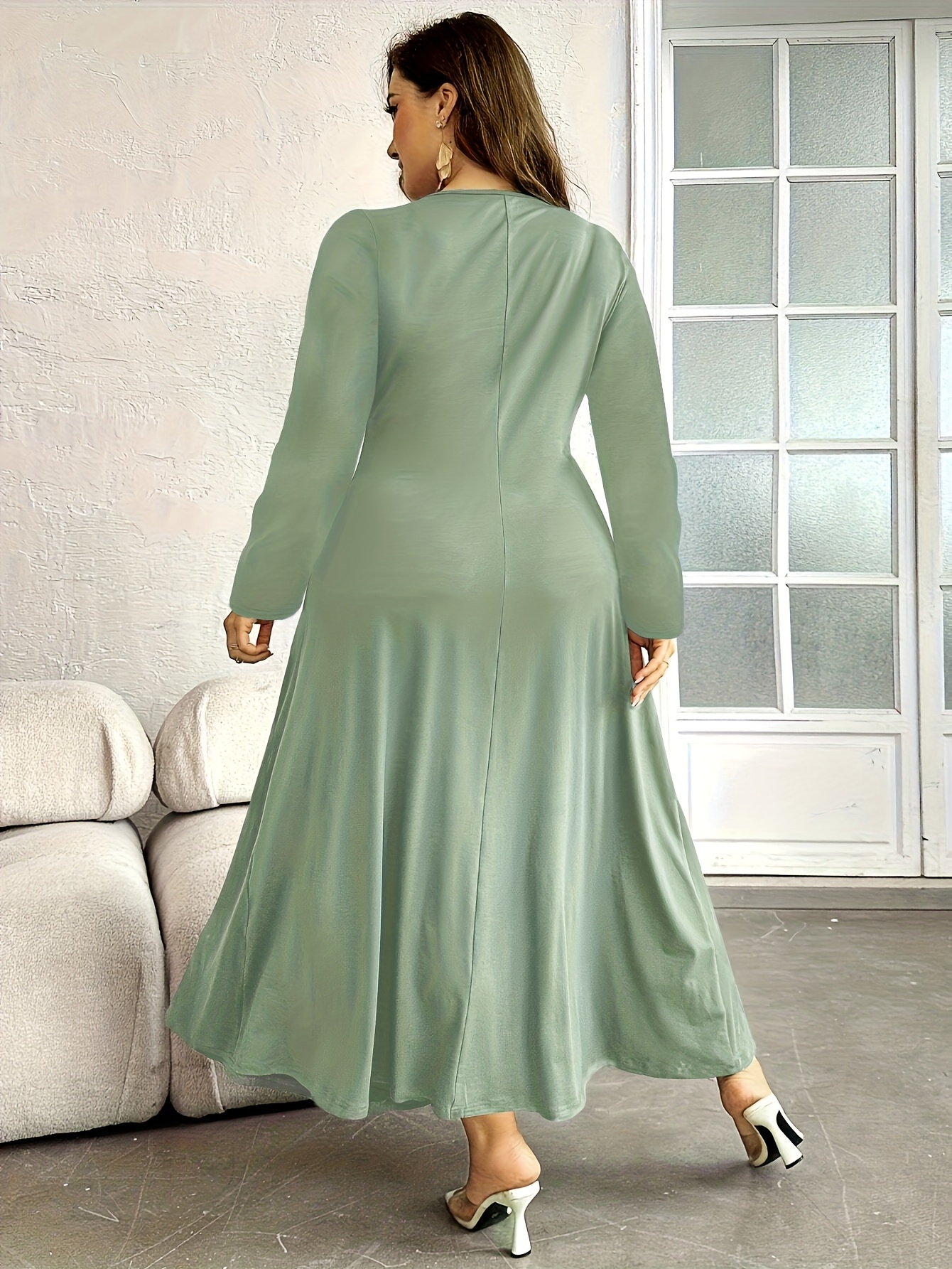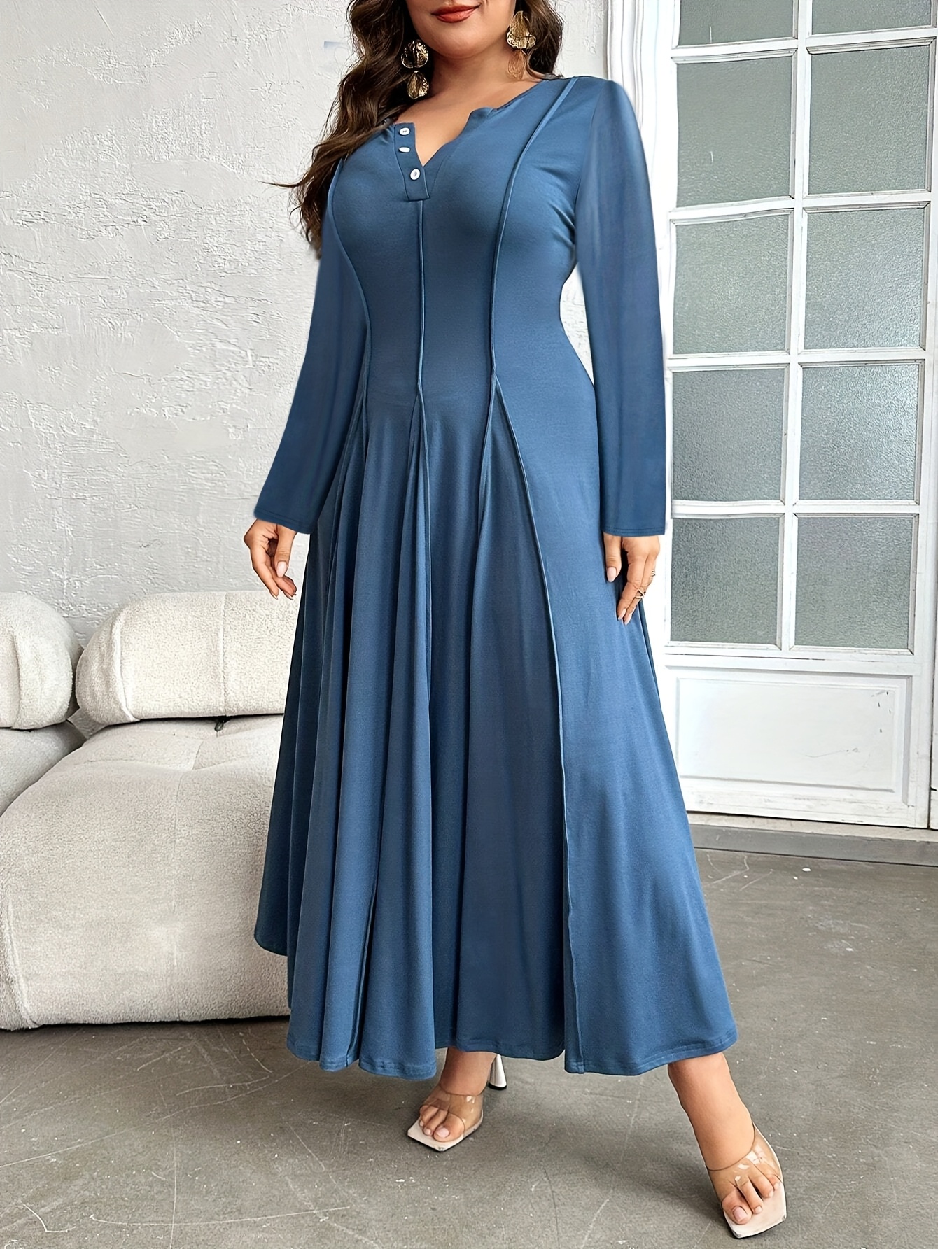 Plus Size, Button- Collar with Pleated Detail Long Sleeve Dress, Suitable for Beach, Party, Summer, Casual, Vacation, and Dating