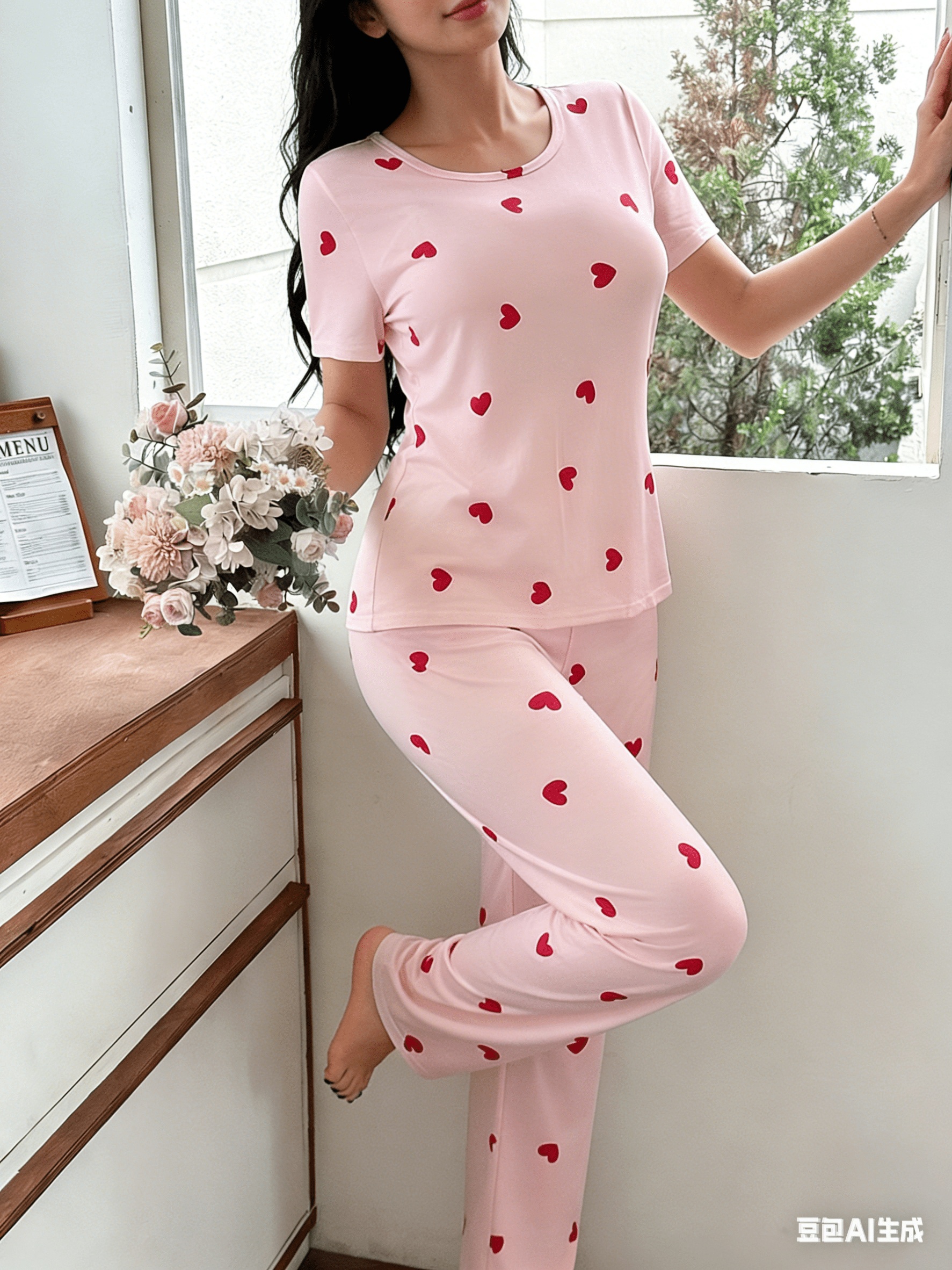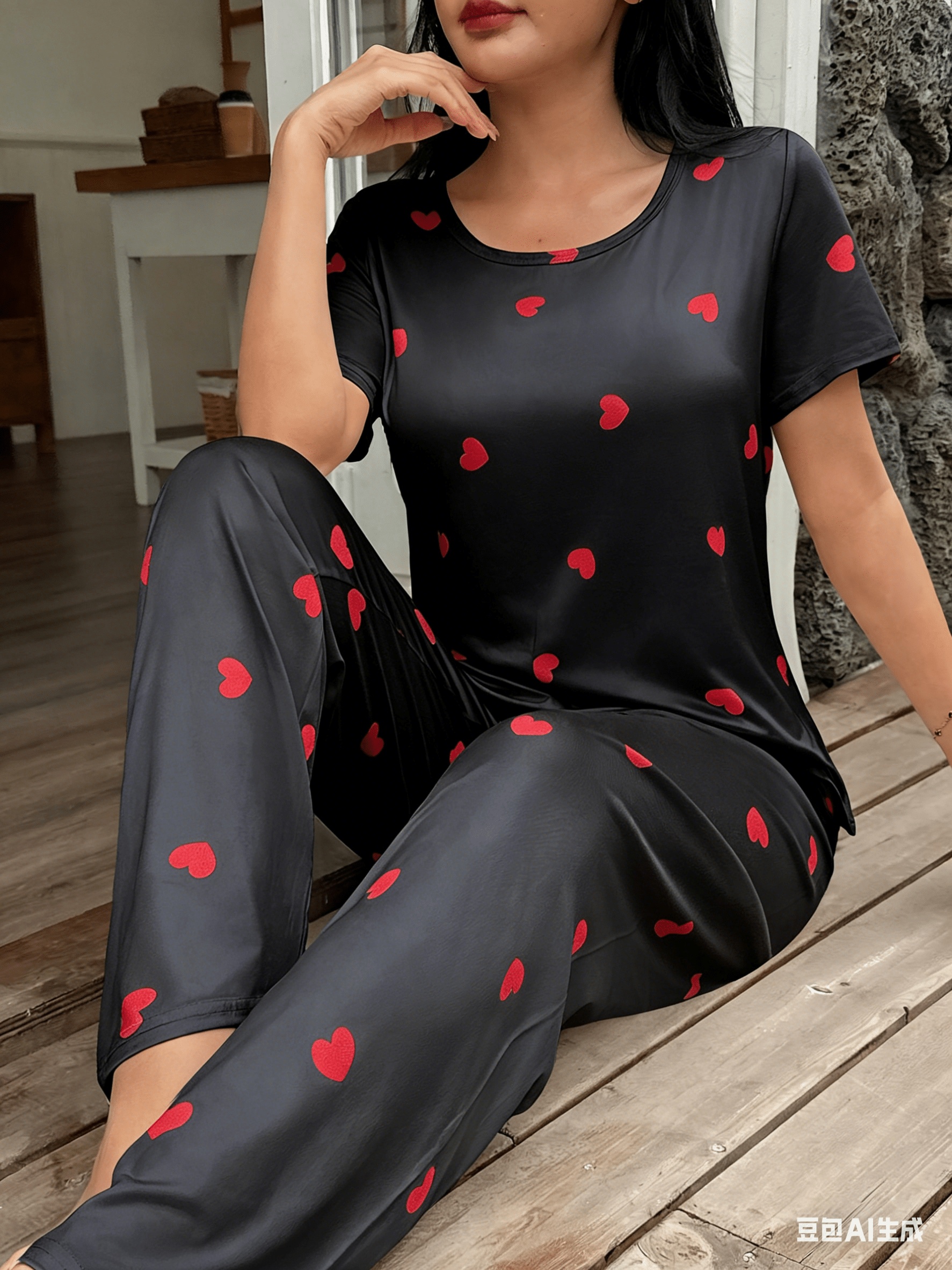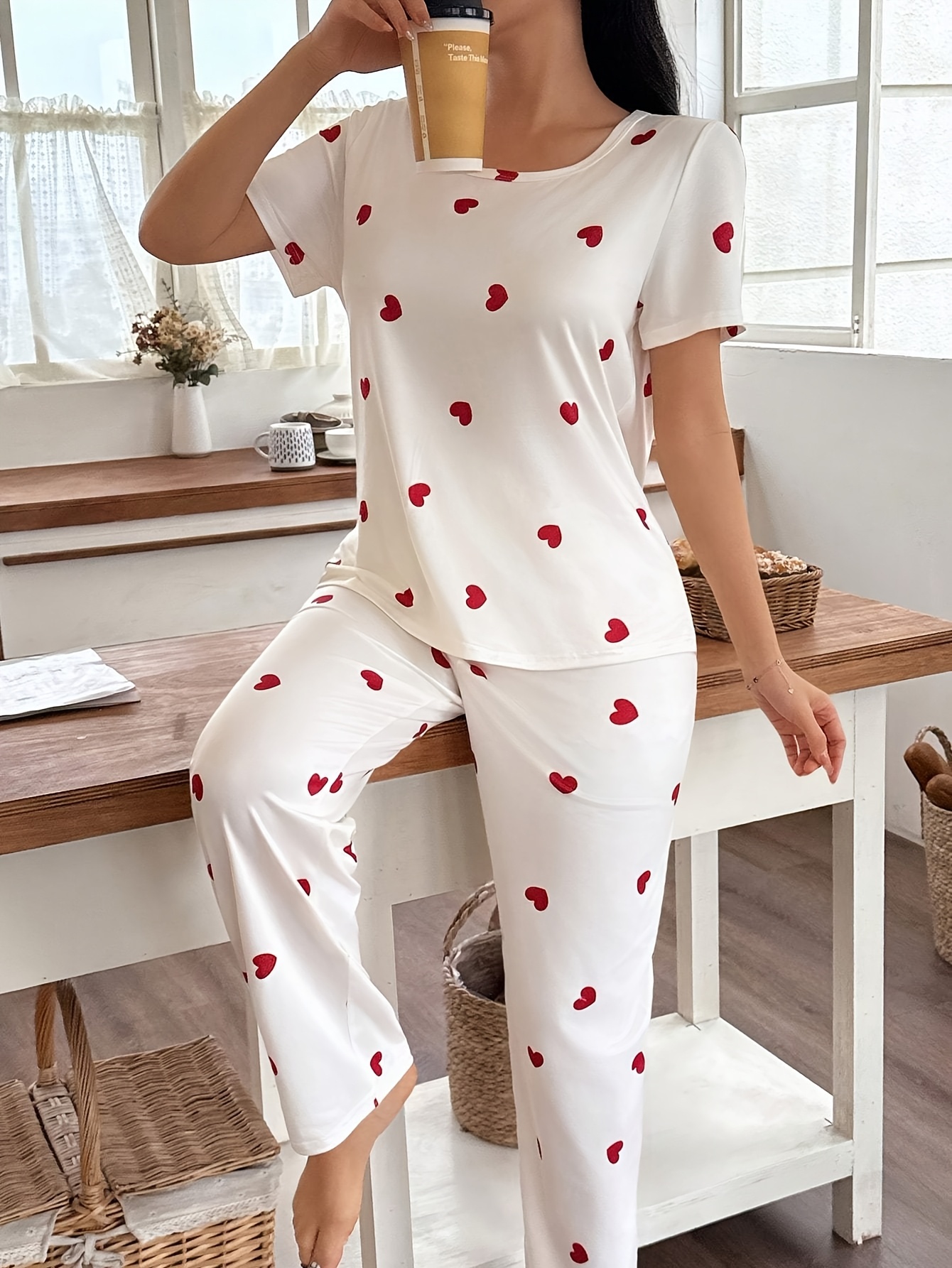 Special Discounts on Popular Items for Autumn And Winter: Women’S Short-Sleeve Pajama Set with Heart Print, Featuring Long Pants for a Comfortable And Casual Fit