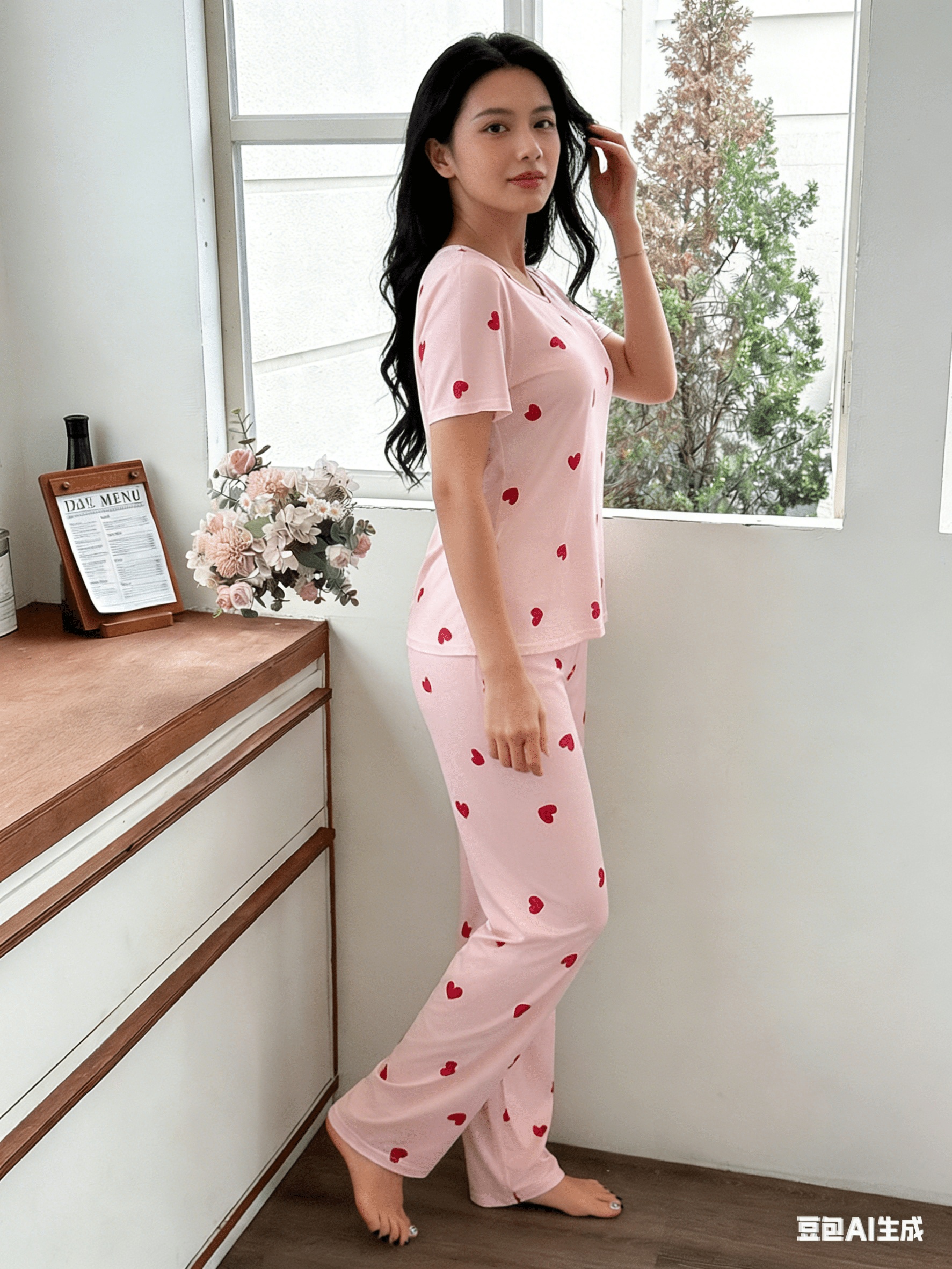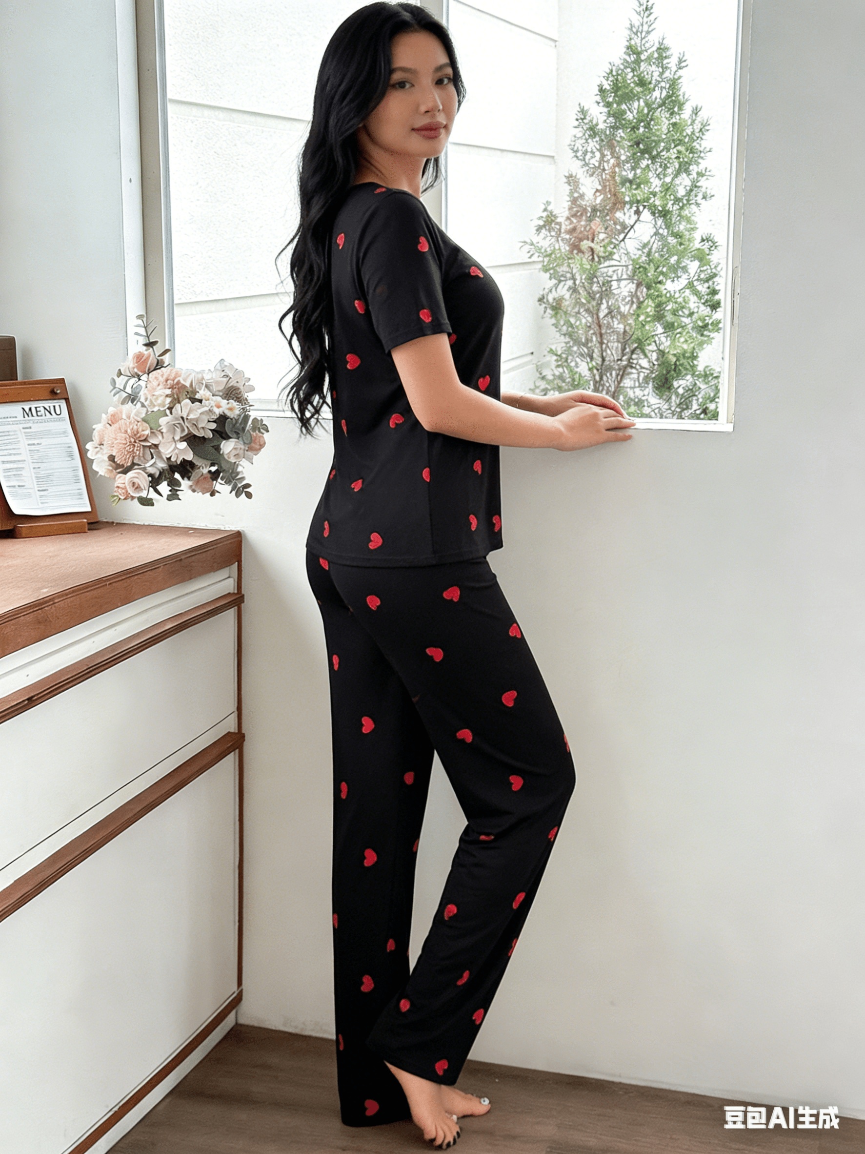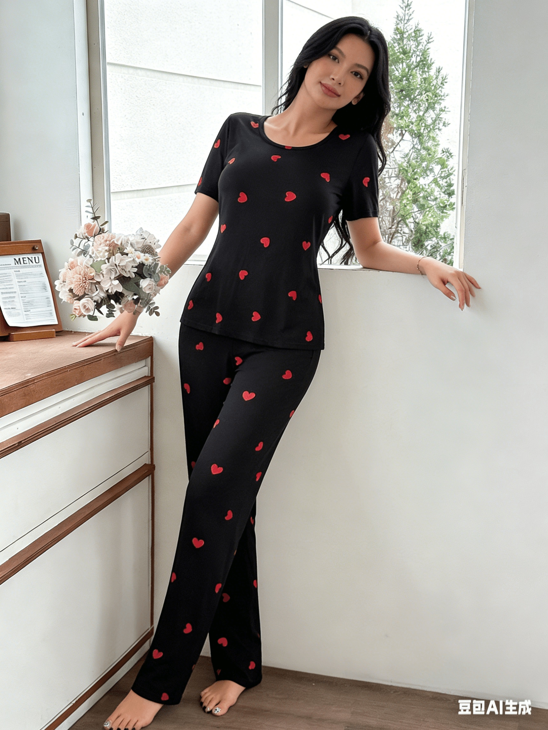 Special Discounts on Popular Items for Autumn And Winter: Women’S Short-Sleeve Pajama Set with Heart Print, Featuring Long Pants for a Comfortable And Casual Fit