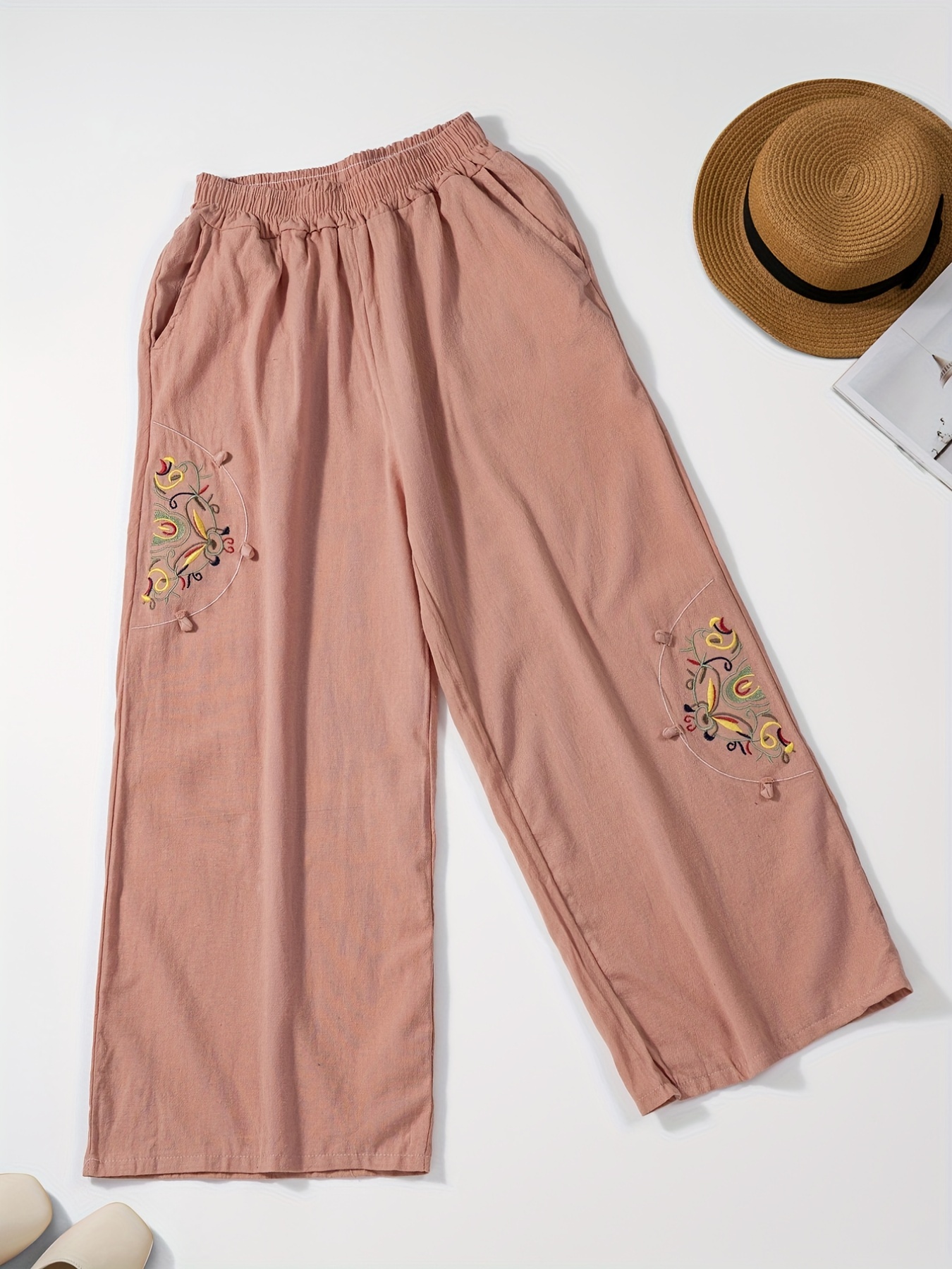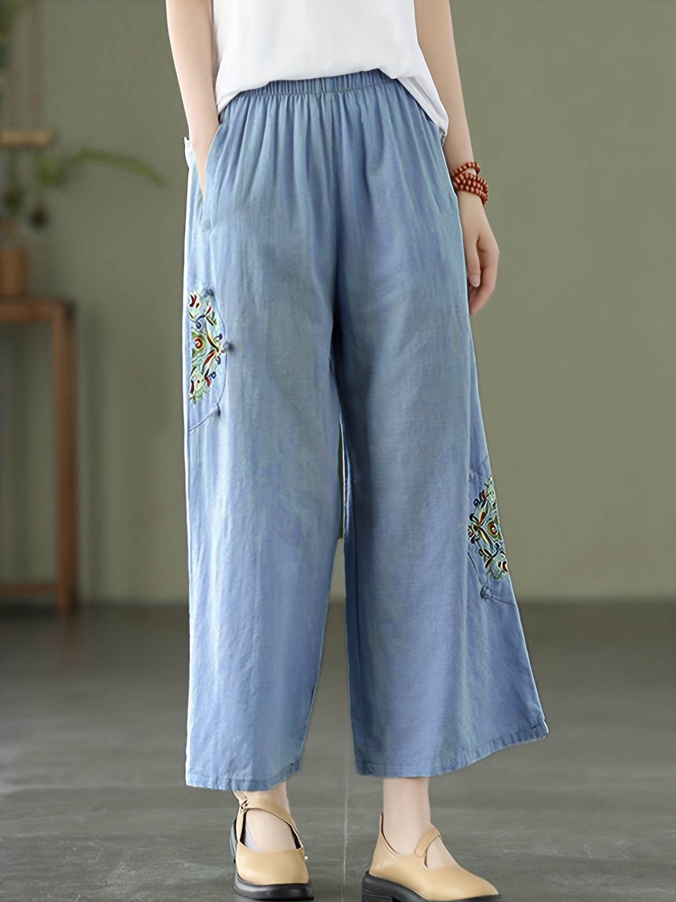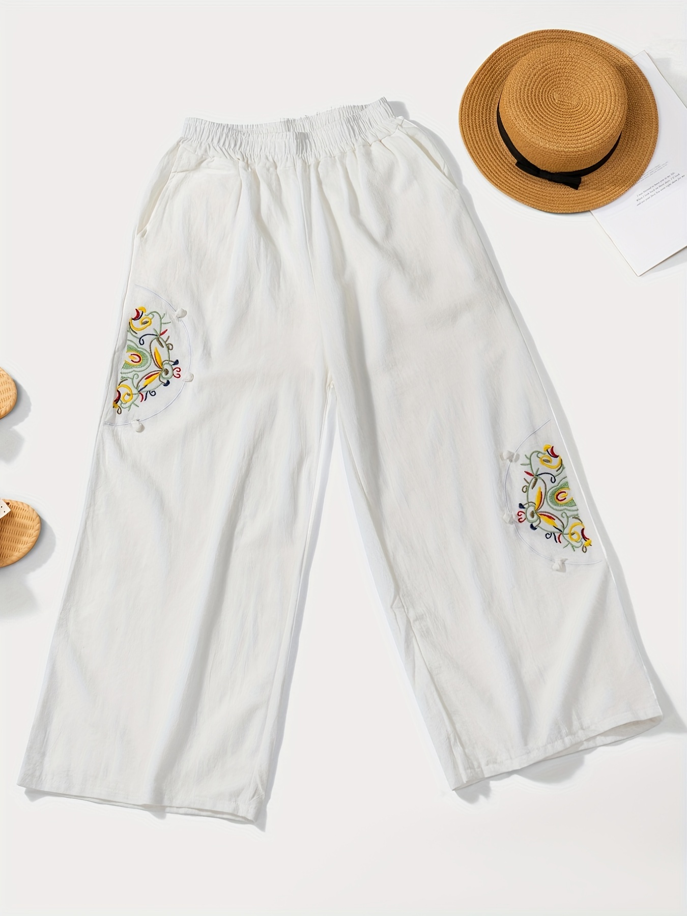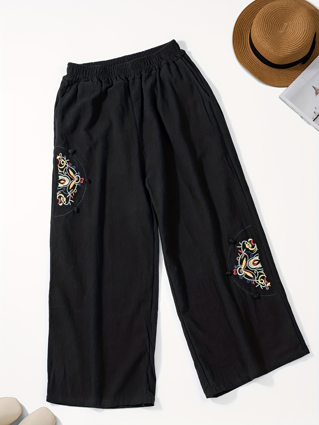Women’s wide-leg pants with pockets and embroidery details – casual straight pants, comfortable for all seasons, machine washable, comfortable clothing, decorative embroidery, soft fabric pants